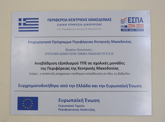 Η Περιφέρεια Κεντρικής Μακεδονίας «ΕΣΠΑ 2014-2020», συμβάλλοντας στην αναβάθμιση της εκπαίδευσης και πιστεύοντας ότι η χρήση πολυμέσων αποτελεί βασικό εργαλείο για την υποστήριξη και ενίσχυση της μάθησης, παραχώρησε στο σχολείο μας οκτώ ηλεκτρονικούς υπολογιστές και αντίστοιχες οθόνες .