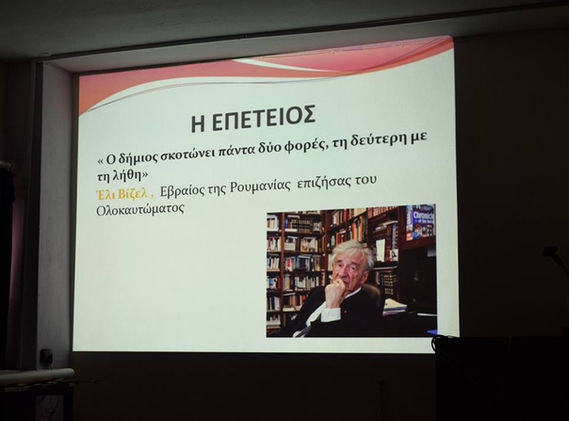 Εκατομμύρια Εβραίοι αλλά και μέλη άλλων μειονοτήτων σφαγιάστηκαν με τον πιο βάρβαρο τρόπο από το ναζιστικό καθεστώς σε στρατόπεδα συγκέντρωσης και εξόντωσης. Η παρουσίαση, που έγινε από τον εκπαιδευτικό μας, κ. Ανδρονίδη Θεολόγο, πλαισιωμένη από οπτικοακουστικό υλικό, αποσκοπούσε στην ενημέρωση των μαθητών, στη διατήρηση της μνήμης και στην υποχρέωση όλων μας να αποτρέψουμε στο μέλλον γενοκτονίες και εγκλήματα κατά της ανθρωπότητας. Ιδιαίτερη έμφαση δόθηκε στην εξόντωση των Εβραίων της Θεσσαλονίκης.